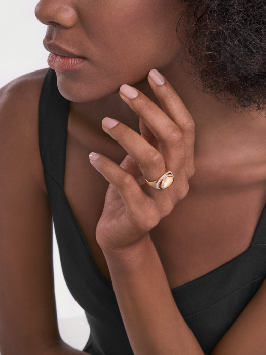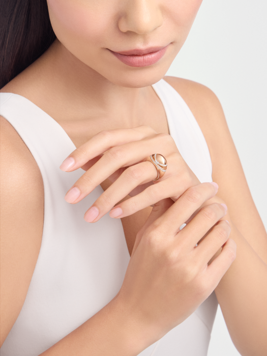 The Bvlgari Cabochon series 18K rose gold ring features two symmetrical convex egg shaped cutting elements integrated into one. showcasing the harmonious combination of volume and shape. It is also a talisman symbolizing love and luck. conveying eternal love or beautiful hopes for happiness. This jewelry piece draws aesthetic inspiration from the classic convex egg cut technique. elevating the pure charm of gold to a higher level. The convex egg cut has been an aesthetic symbol of Bvlgari since the 1950s. allowing the natural charm of gemstones to be fully displayed. while the exquisite and delicate diamond inlay adds precious texture to the work.