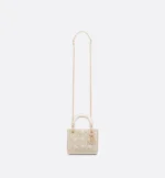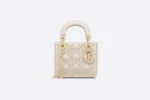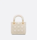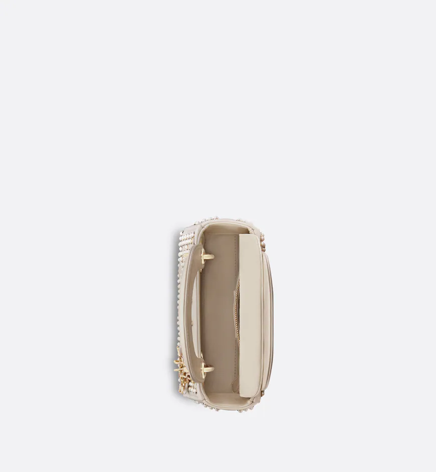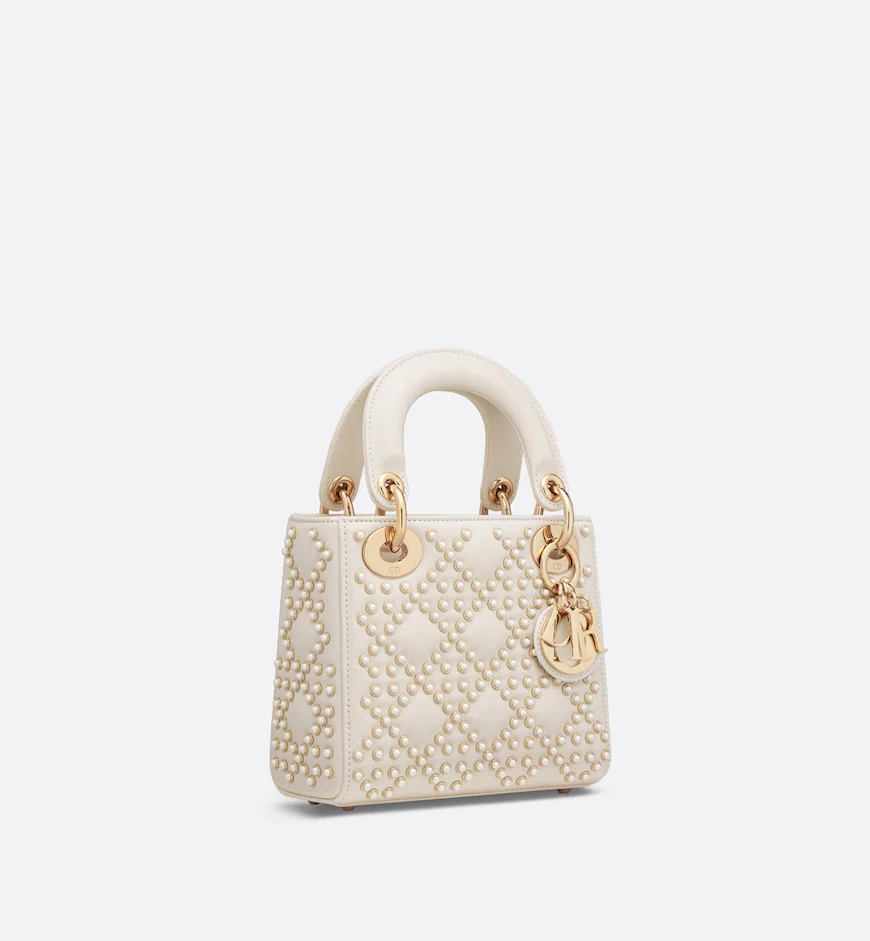The Lady Dior bag embodies the House’s vision of elegance and beauty. Sleek and refined. the style is timeless. Crafted in latte lambskin with a crinkled effect. it is adorned with white resin half-pearls and rivets displaying the Cannage motif. Pale gold-finish metal D.I.O.R. charms further embellish its silhouette. Featuring a removable chain strap. the miniature Lady Dior bag can be carried by hand or worn crossbody as an ideal evening wear companion.