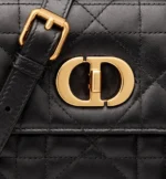 The Miss Caro mini bag enhances the Dior Caro line with modern and timeless elegance. Crafted in black embroidery with a tweed-effect texture. it is embellished with a mix of threads displaying the Cannage motif. as well as a flap accented by a gold-finish metal CD twist clasp inspired by the seal of a Christian Dior perfume bottle. Alternating between gold-finish metal links and tonal enamel links that match the leather. the adjustable chain shoulder strap has a leather insert for added comfort when carrying the bag by hand or wearing it crossbody.