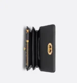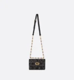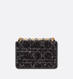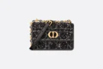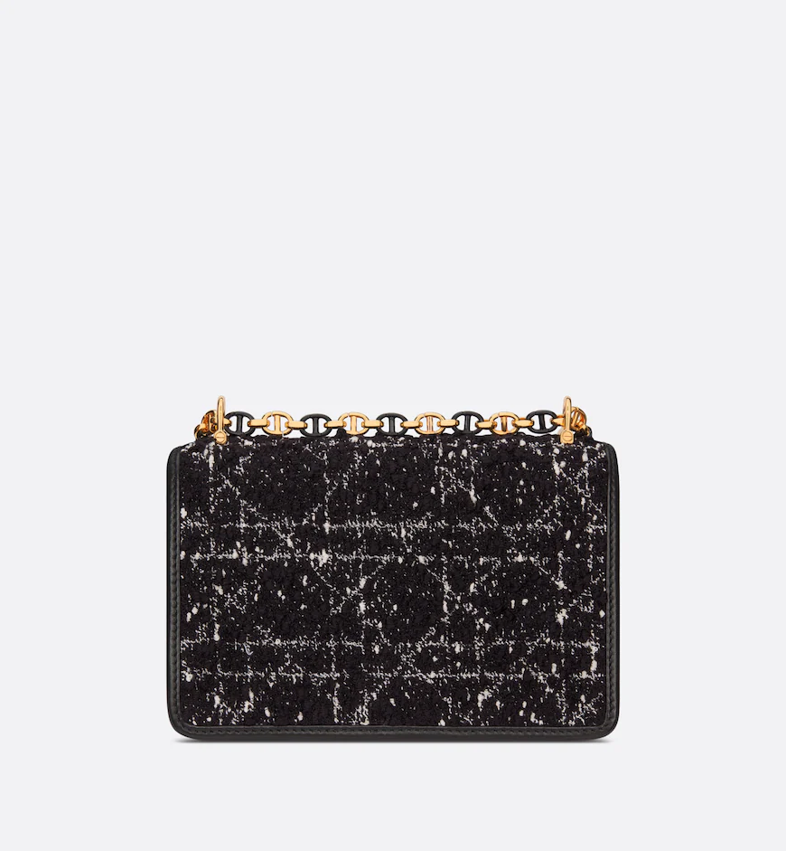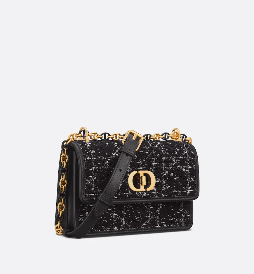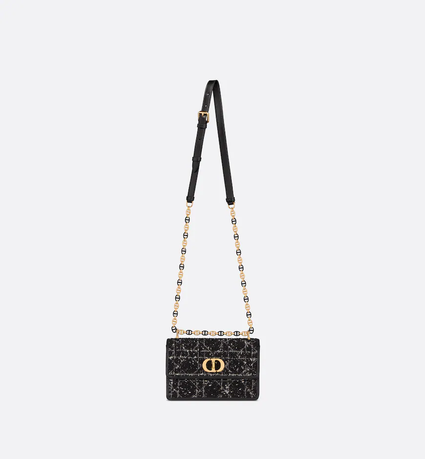 The Miss Caro mini bag enhances the Dior Caro line with modern and timeless elegance. Crafted in black embroidery with a tweed-effect texture. it is embellished with a mix of threads displaying the Cannage motif. as well as a flap accented by a gold-finish metal CD twist clasp inspired by the seal of a Christian Dior perfume bottle. Alternating between gold-finish metal links and tonal enamel links that match the leather. the adjustable chain shoulder strap has a leather insert for added comfort when carrying the bag by hand or wearing it crossbody.