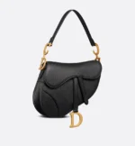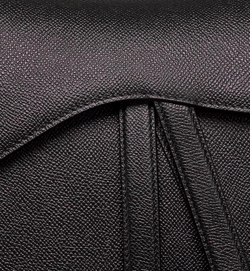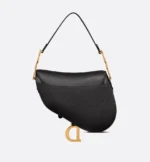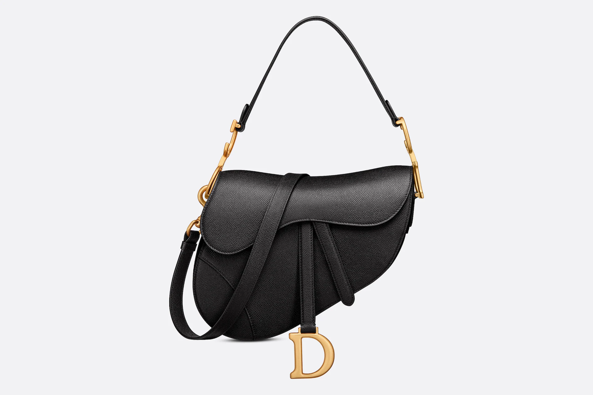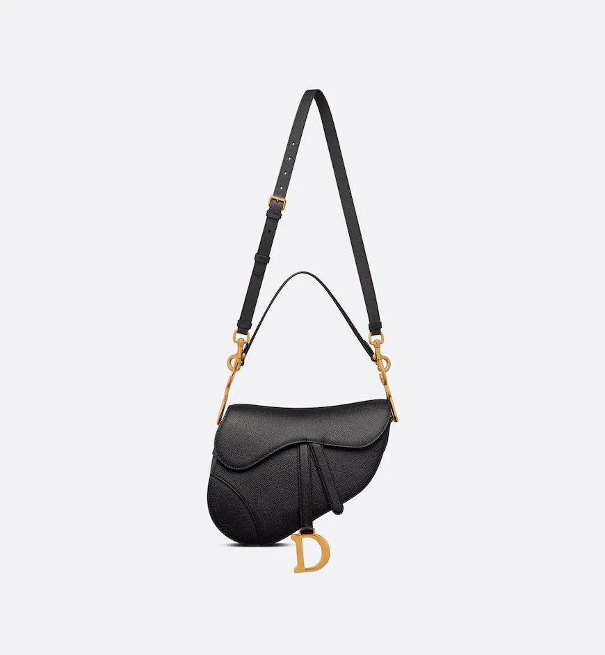 Maria Grazia Chiuri brings a fresh update to the iconic Saddle bag. Crafted in black grained calfskin. the legendary design features a Saddle flap with a D stirrup clasp on a magnetic strap. as well as an antique gold-finish metal CD signature on either side of the strap. Equipped with a thin. adjustable and removable shoulder strap. the Saddle bag may be carried by hand. worn over the shoulder or crossbody.
