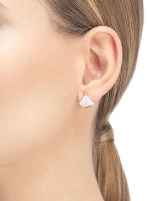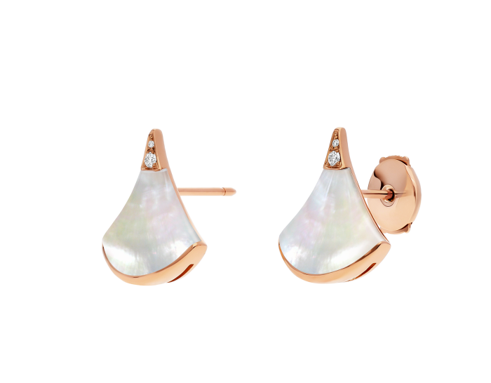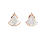 Divas’ Dream earrings draw inspiration from the elegant temperament of women and the enchanting aura of the Eternal City. paying tribute to the most charming women with a unique Roman spirit. This earring exudes a strong feminine charm and exquisite elegance. showcasing the splendor of the Caracalla Bathhouse marble and the enchanting curves of fan-shaped mosaics. embodying the true essence of Italian aesthetics. Divas’ Dream series earrings. made of rose gold material. adorned with mother of pearl and diamond inlay.