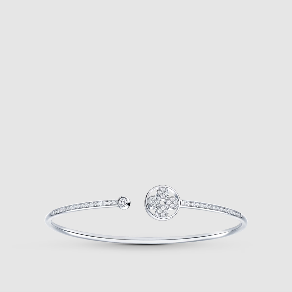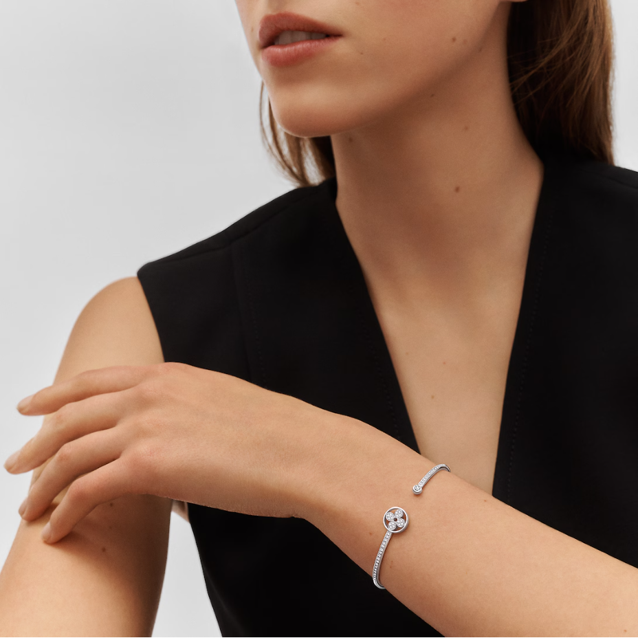This 18-karat white gold Idylle Blossom Twist bracelet is richly decorated with sparkling diamonds. Stylish and playful. it is decorated with Georges-Louis Vuitton’s 1896 Monogram Flower sun pattern and can be worn alone or paired with other accessories.