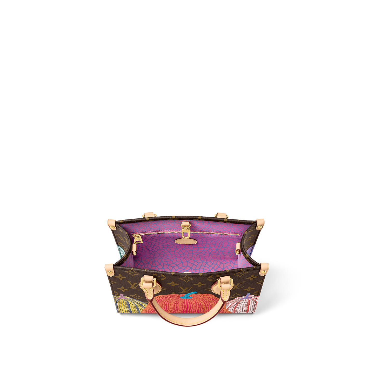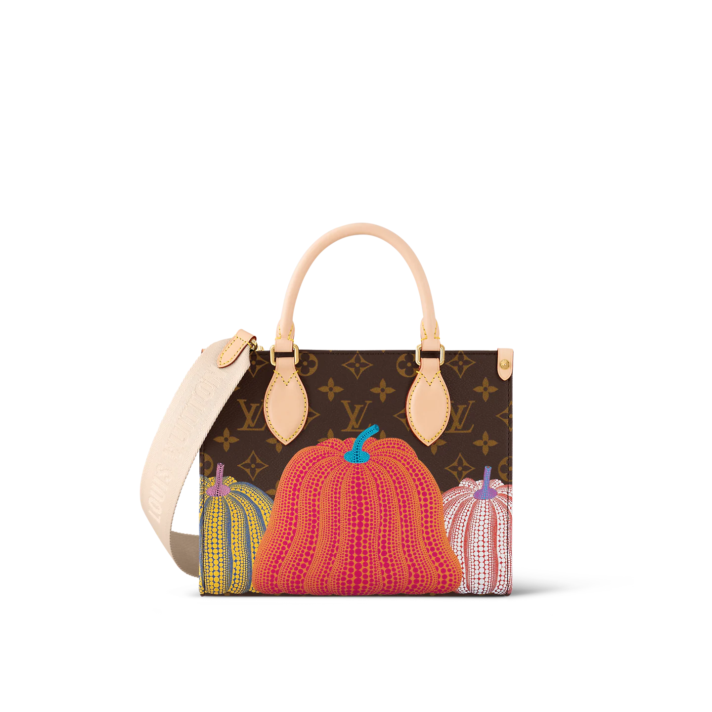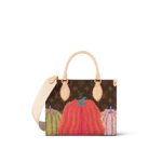 For the Louis Vuitton x Yayoi Kusama collection. the LVxYK OnTheGo PM captures the spirit of the Japanese artist’s work with a unique and creative print. Kusama has made pumpkins a visual signature. an emblem of her irrepressible energy and enthusiasm. For this user-friendly bag. Monogram canvas is embellished with a series of pumpkins in warm colors. And it comes with a separate pumpkin-print coin purse on the strap.