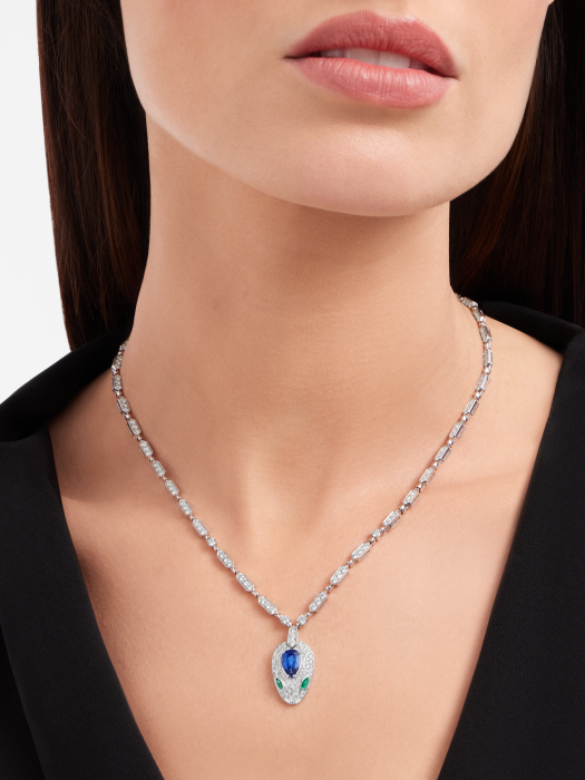 The inspiration for the Bulgari Serpenti series logo comes from the transformation trait of the mysterious spirit snake shedding its skin to actively seek change and regain power. Since 1948. it has been a fitting symbol of endless change. The Serpenti series white 18K gold pendant necklace is meticulously set with sparkling diamonds. emerald snake eyes. and a blue sapphire. cleverly blending excellent craftsmanship and extraordinary wearing experience. showcasing an irresistible charm and timeless beauty. As an inexhaustible source of strength and confidence. always keeping up with the times.