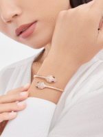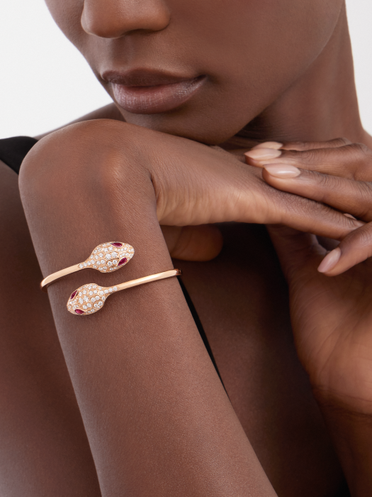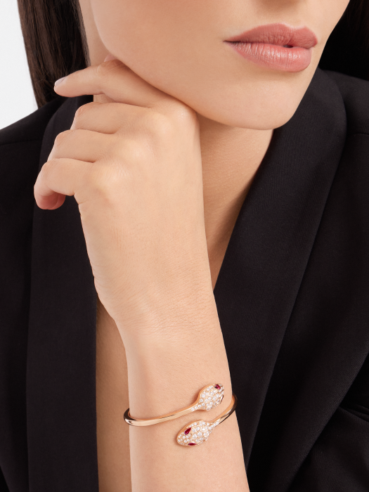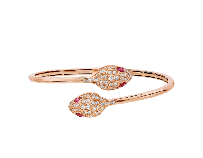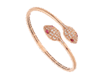 The inspiration for the Bulgari Serpenti series logo comes from the transformation trait of the mysterious spirit snake shedding its skin to actively seek change and regain power. Since 1948. it has been a fitting symbol of endless change. The Serpenti series 18K rose gold bracelet is meticulously set with sparkling inlaid diamonds and red tourmaline snake eyes. cleverly blending excellent craftsmanship with extraordinary wearing experience. showcasing irresistible charm and timeless beauty. As an inexhaustible source of strength and confidence. always keeping up with the times.