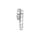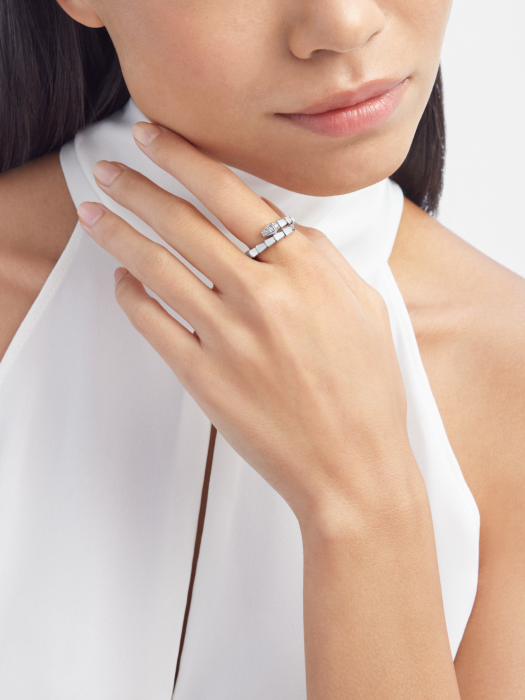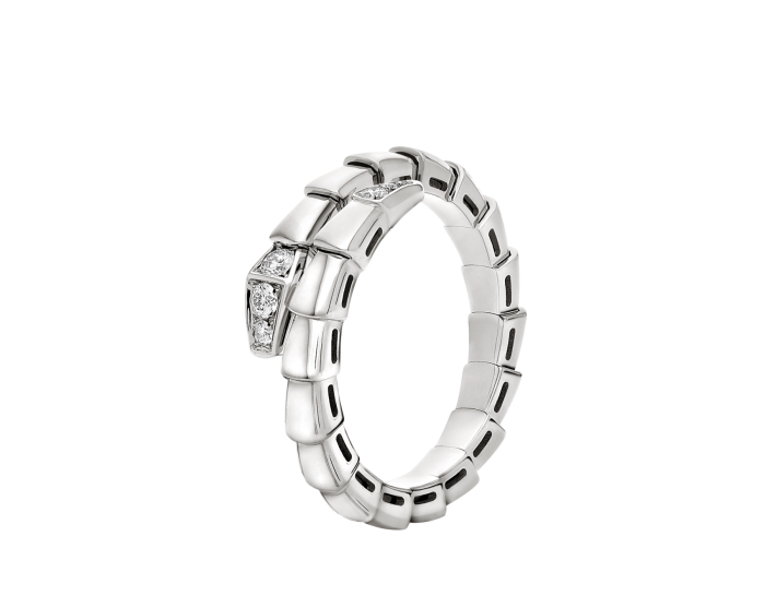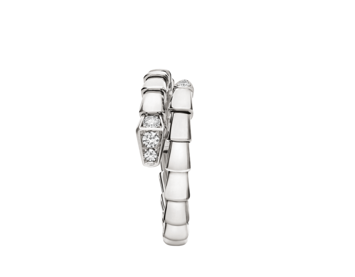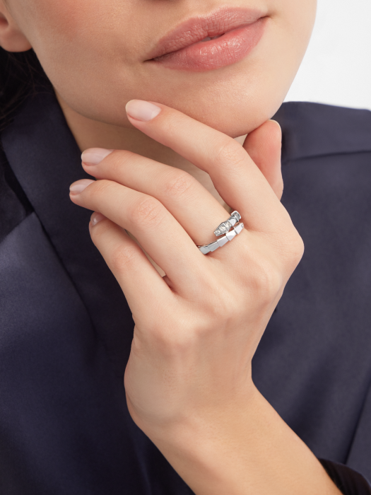 Serpenti Viper series ring. made of white 18K gold material. adorned with semi dense diamonds.