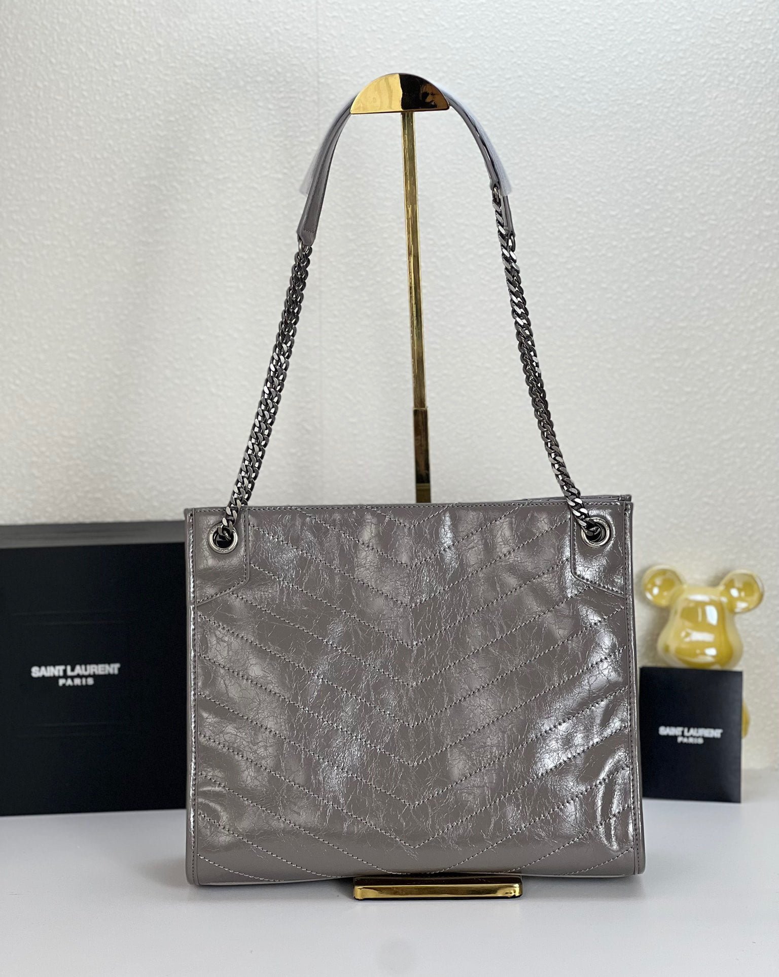 YSL NIKI Wrinkled retro oil wax skin Shoulder and backbody tote bag grey 577999 size: 33*27*11.5 cm